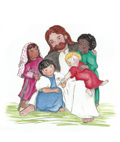 Jesus the Christ, Baby Jesus, Blessed Virgin Mary, and Girl and Boy Angels.